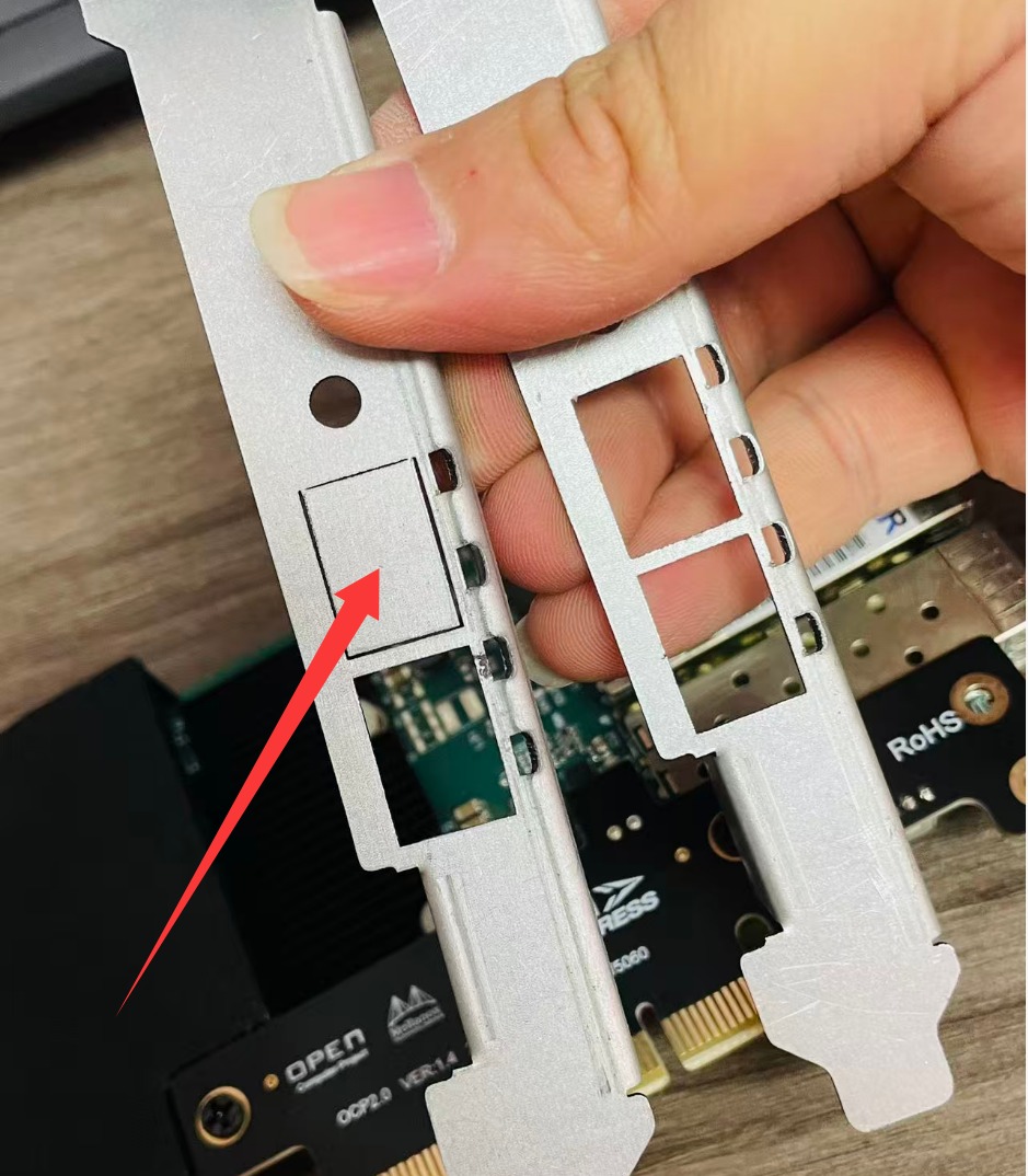 - 安装挡片,如果是双口网卡把半冲口掰一下,掰成如右侧的双口版本,对准螺丝孔拧上M3的螺丝即可