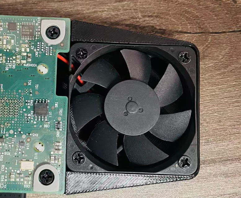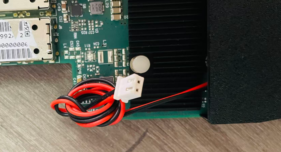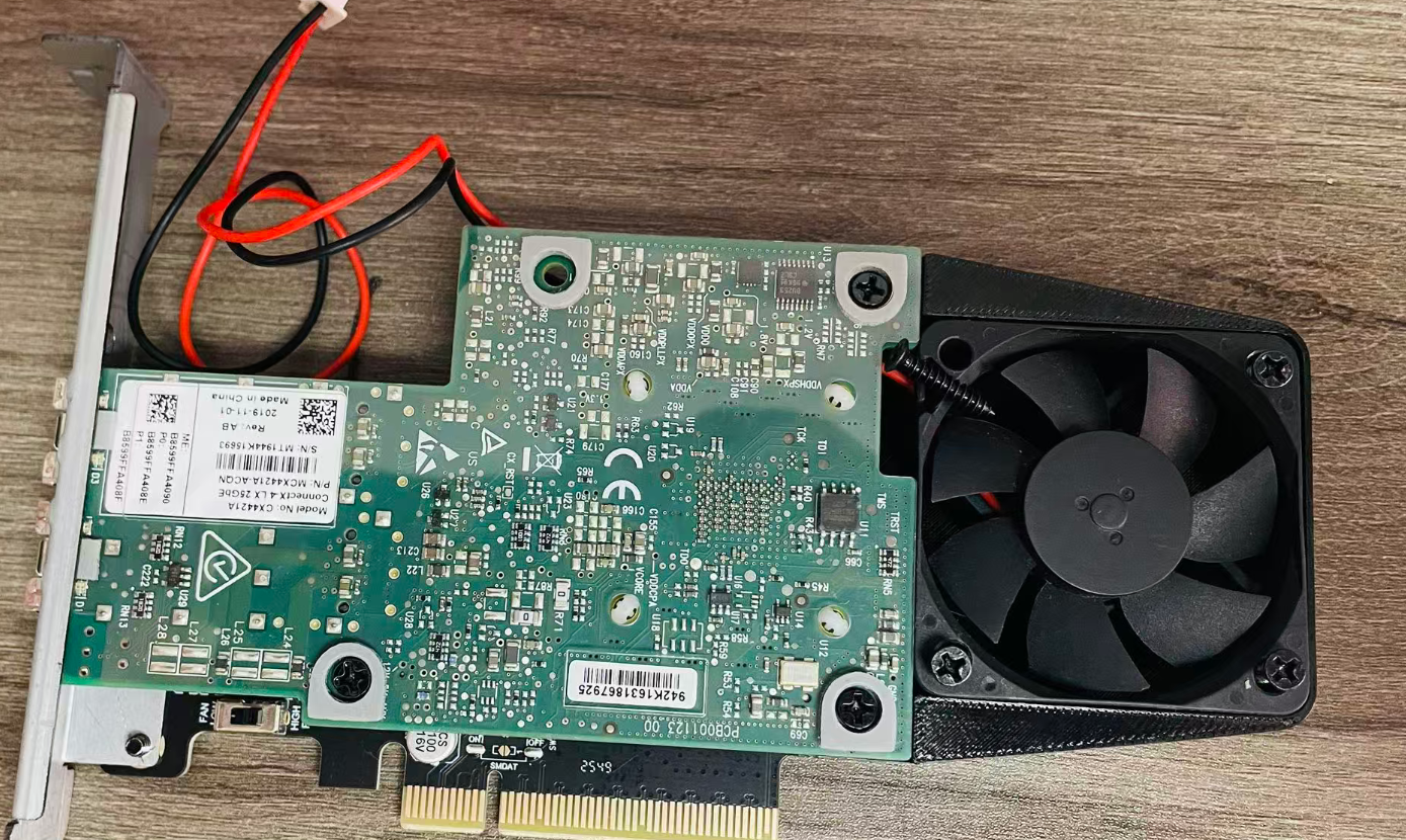 - 把风扇的风罩如下图安装,并使用下图所示的螺丝进行固定,如果你的网卡散热片太大会挡住风扇接口穿过的话建议拧螺丝前先把风扇的电源线塞过去,Mellanox的网卡的散热片一般是不会挡住的,intel的要注意一下。